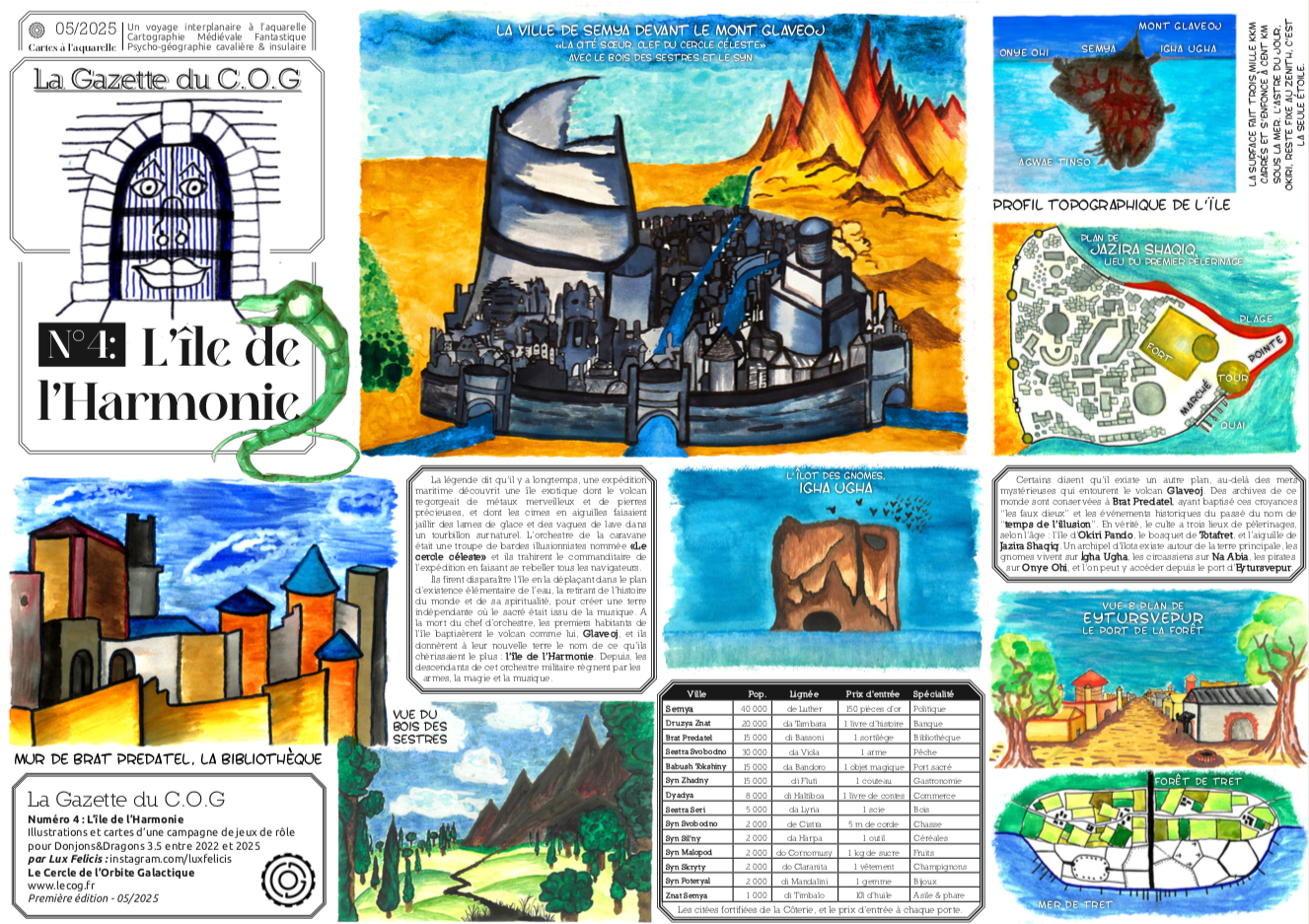 Avec l’Île de l’Harmonie, tout est inventé par LuxFelicis, mais traité comme un vrai territoire : cartes, villes, populations, mythes… On a l’impression de lire un vieux guide de voyage d’un monde parallèle médiéval. Et en fait, c’est issu d’une campagne de jeu de rôle, restituée en cartes et en récits. Tout est pris au sérieux, jusque dans les détails.