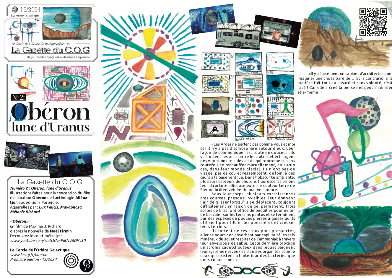 Les croquis de travail du court-métrage Obéron. Extraits de la nouvelle originale, plan de la galaxie et détails anatomiques des Arges.