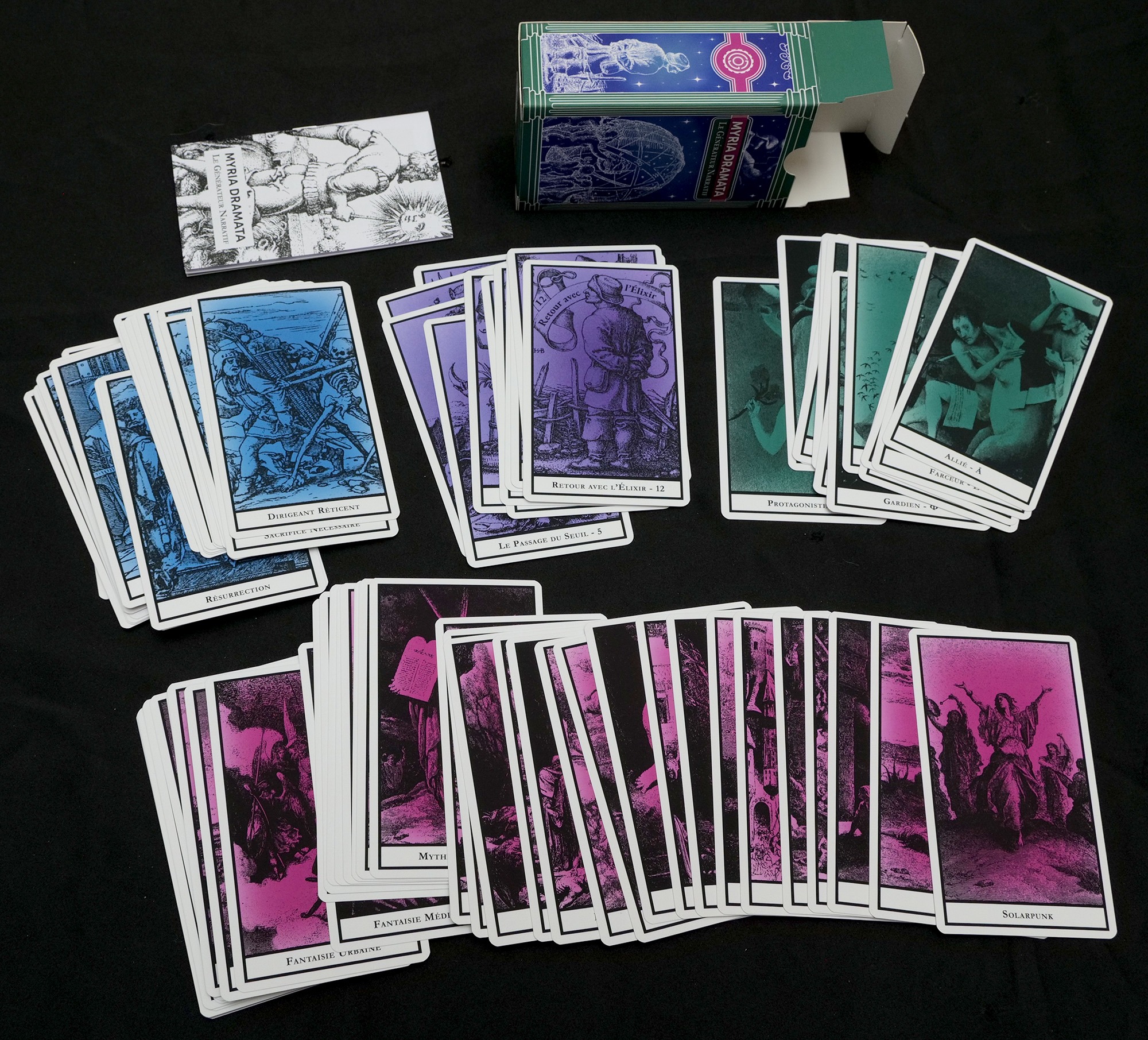 Disponible sur la boutique du C.O.G ainsi que sur les marchés et événements ou se rend le C.O.G, Myria Dramata se découvre pleinement en pratique. Vous pouvez tirer des cartes, interpréter un rôle, improviser une scène : chaque combinaison offre une expérience narrative unique, où l’histoire émerge du tirage.
