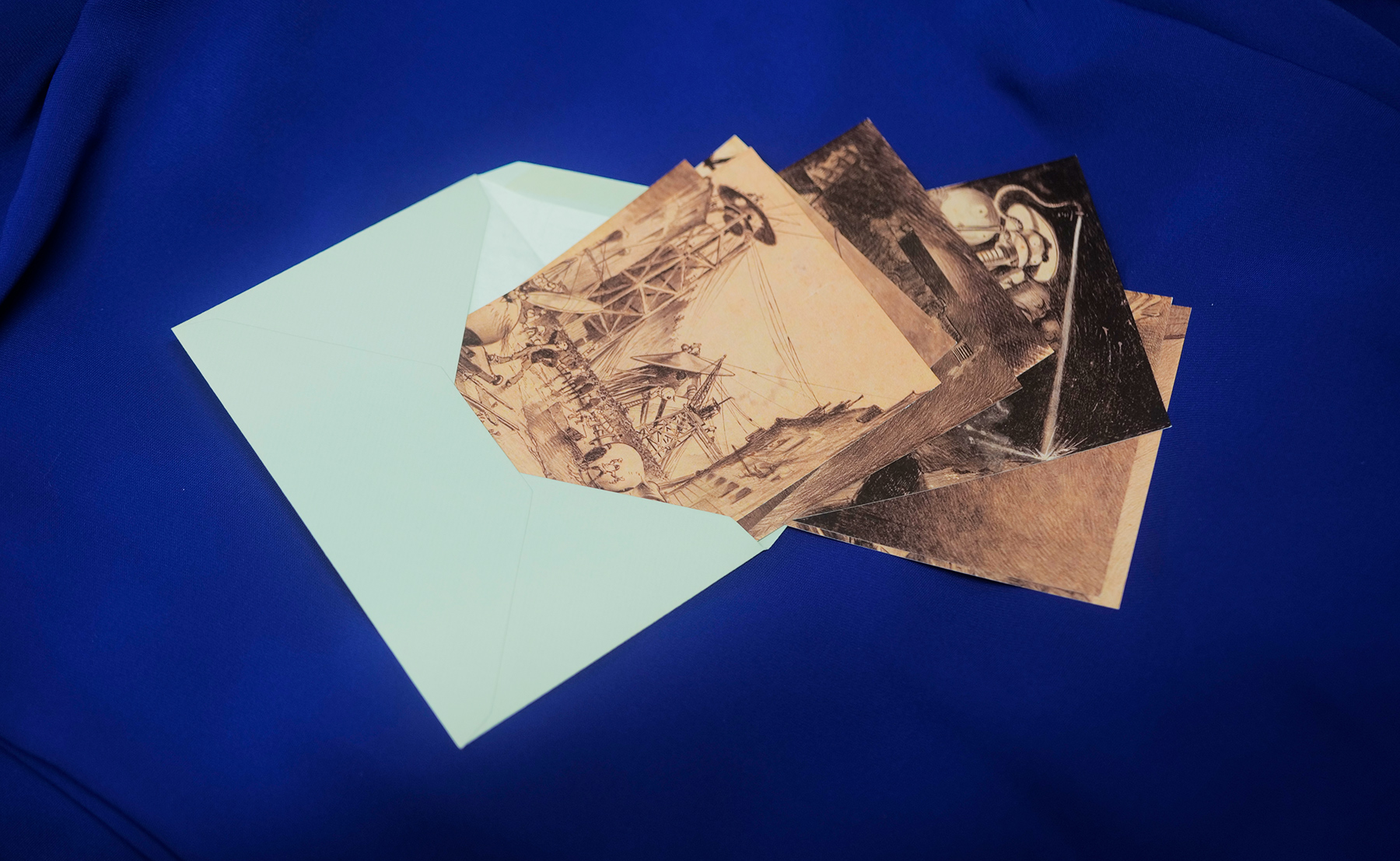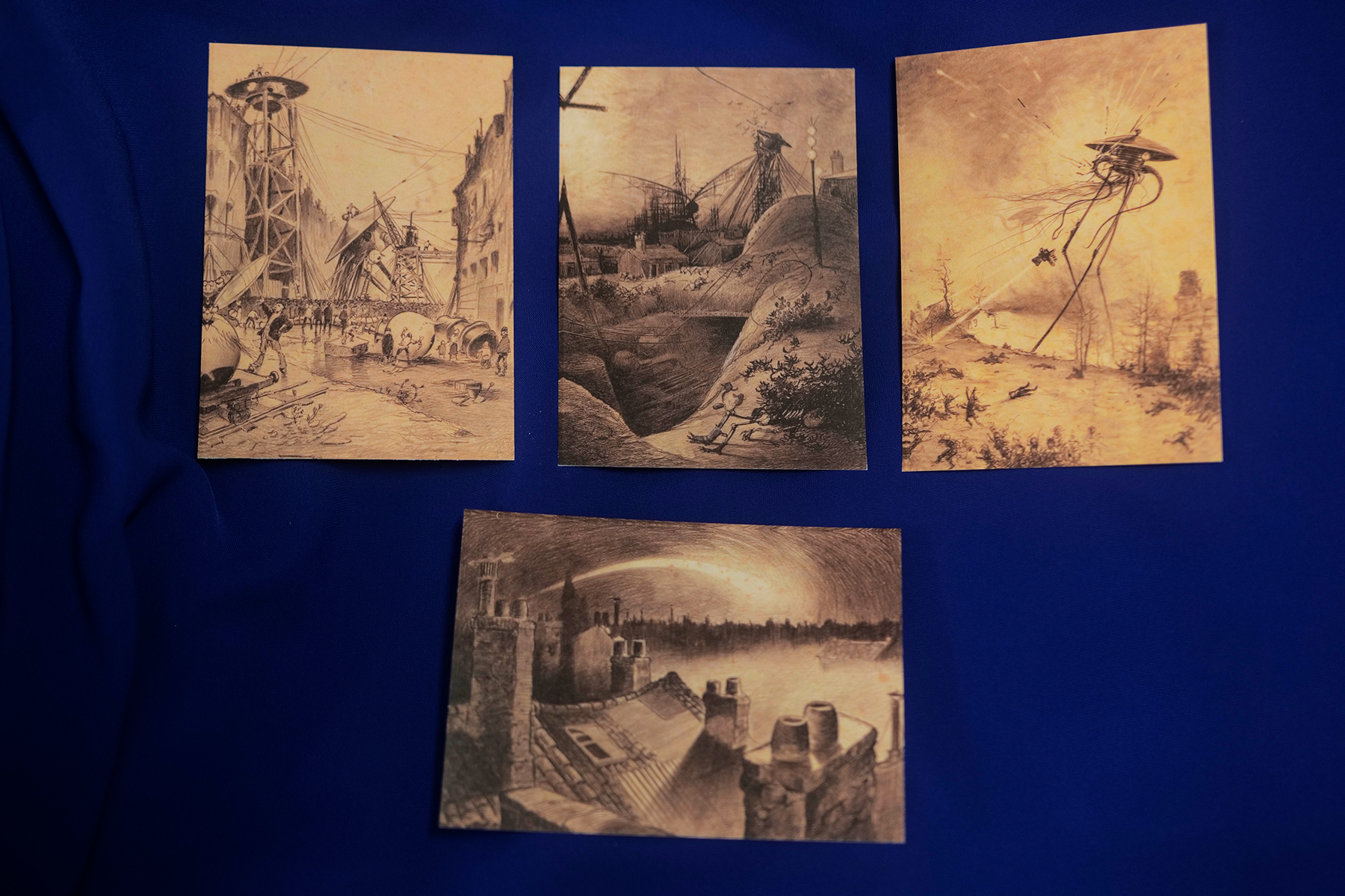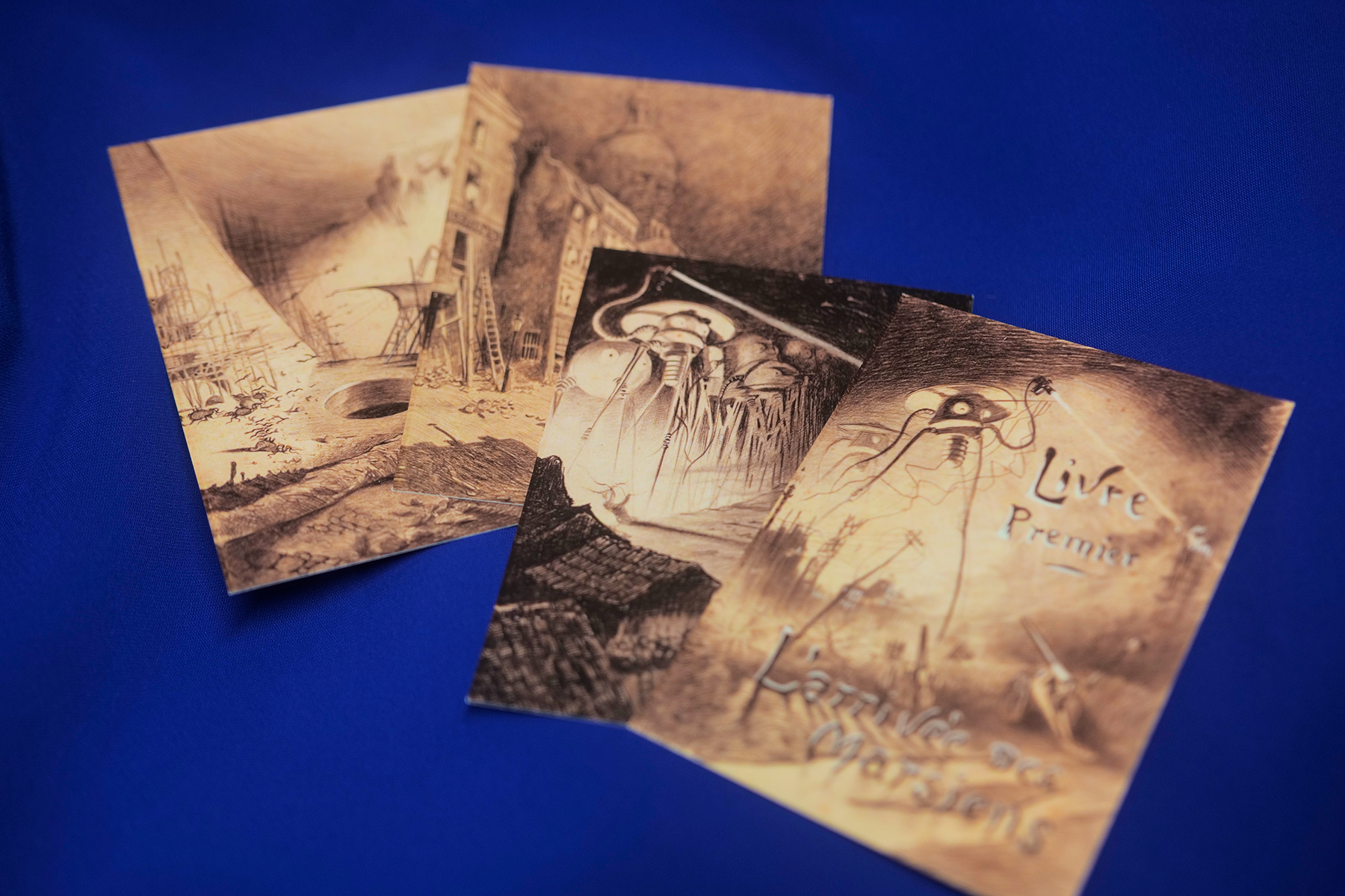 Huit (8) cartes postales, illustrées par Henrique Alvim Corrêa, issues de La Guerre des mondes (1906) avec une (1) enveloppe “de prestige”. Elles sont imprimées en première édition limitée de seize (16) ensembles. Cette impression limitée est réalisée en préparation du financement participatif de “Jeux de Guerres”.