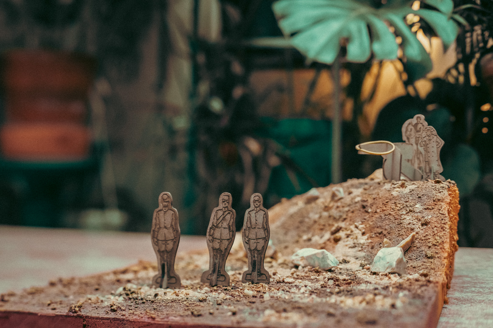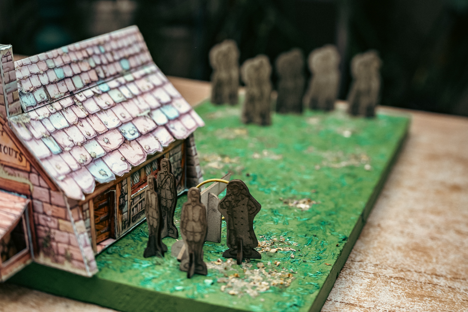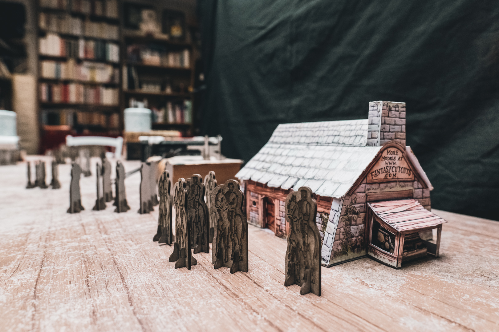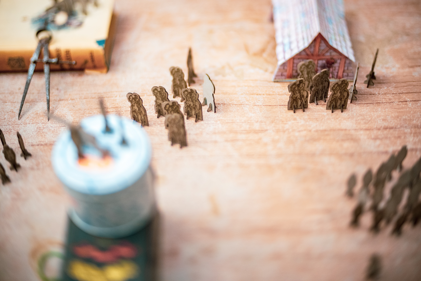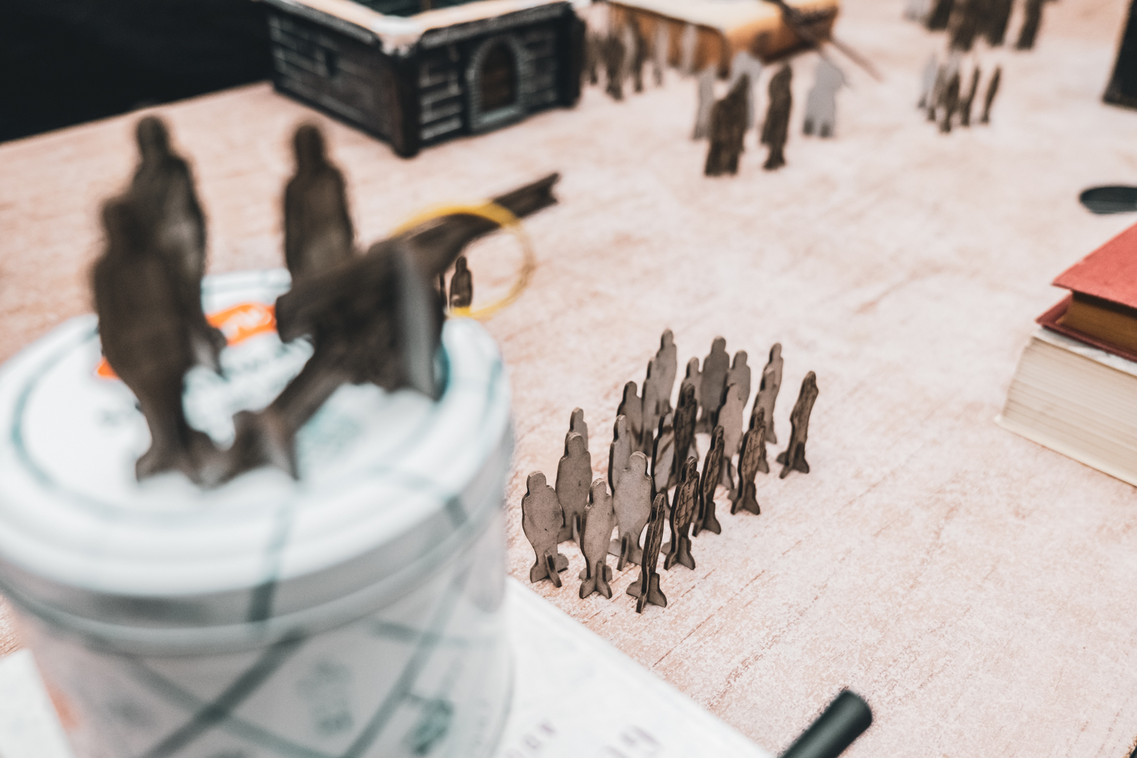 Les figurines de soldats ont été faites en prototypes à la découpeuse laser Trotec 400 au FabLab de la Villette, le Carrefour Numérique. Une version aboutie de la découpe a été faite en avril, sans couleur, en carton craft 3mm. Déjà, plusieurs versions fonctionnelles ont permis de faire des parties avec les règles de Wells qui sont très efficaces et amusantes. Quelques petits ajustements et une synthèse seront ajoutés par le C.O.G.