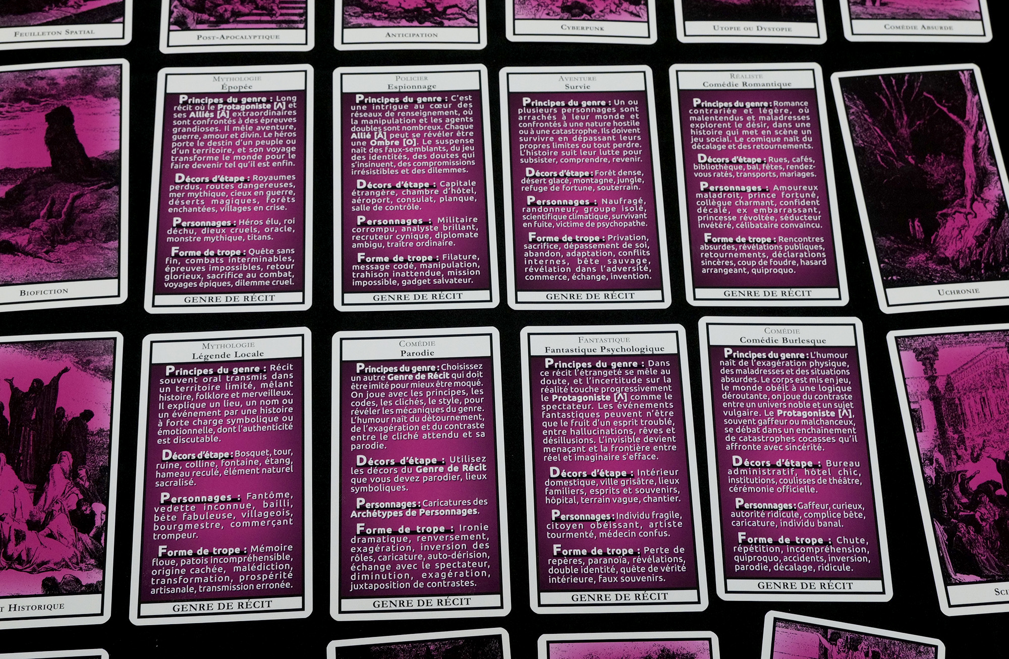Pensé pour 1 à 12 participants, le concept s’appuie sur les 12 étapes du Voyage du Héros, enrichies par 13 archétypes de personnages, 28 tropes narratifs et 43 genres de fiction, présentés dans le tableau ci-dessous. Chaque combinaison produit une histoire différente.