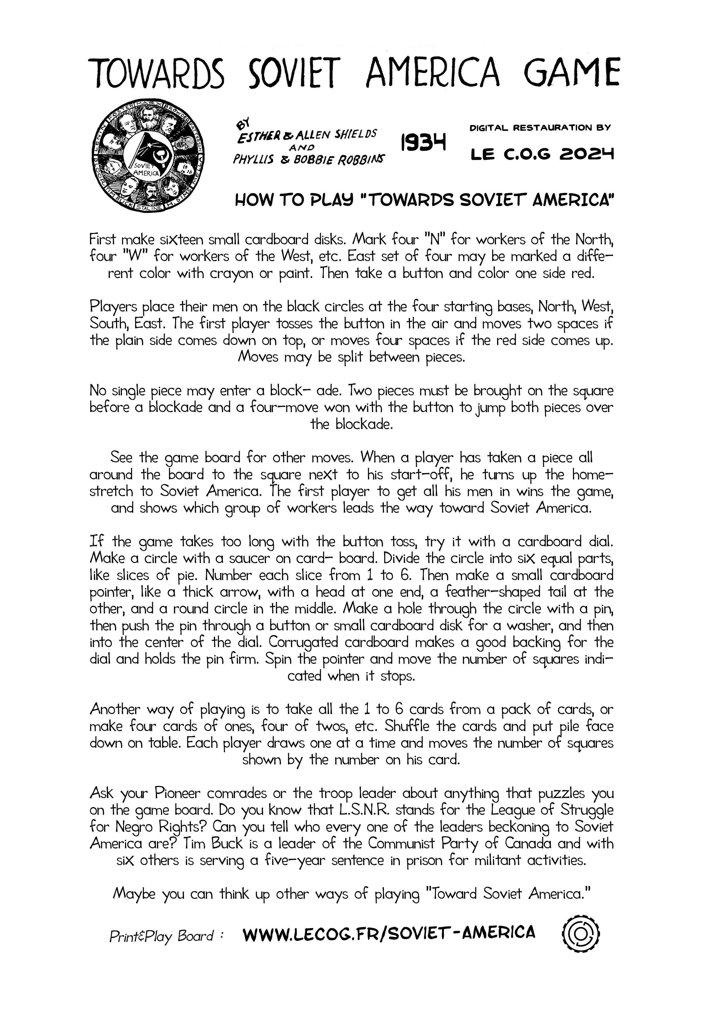 Ask your Pioneer comrades or the troop leader about anything that puzzles you on the game board. Do you know that L.S.N.R. stands for the League of Struggle for Negro Rights? Can you tell who every one of the leaders beckoning to Soviet America are? Tim Buck is a leader of the Communist Party of Canada and with six others is serving a five-year sentence in prison for militant activities.